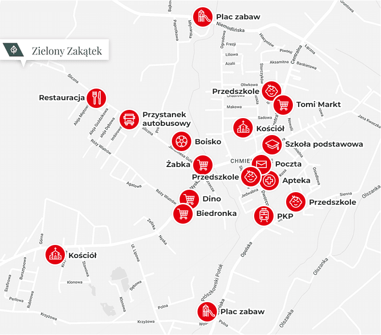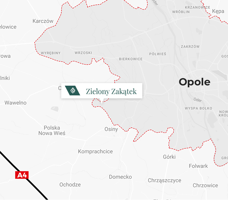 Zielony Zakątek znajduje się w pobliżu natury – nie tylko wspomnianego lasu z urokliwymi stawami, ale także np. Parku Dworskiego Chróścina czy licznych ścieżek pieszo-rowerowych. W ok. 3 min można dotrzeć do przedszkola i szkoły podstawowej. Niedaleko również do centrum Opola (15 min samochodem) oraz wielu jego atrakcji: Wyspy Bolko, kąpieliska, ZOO Opole, basenu Wodna Nuta, filharmonii, teatru czy centrów handlowych. Podróżowanie po całym regionie ułatwia bliskość kluczowych tras, w tym m.in. autostrady A4.