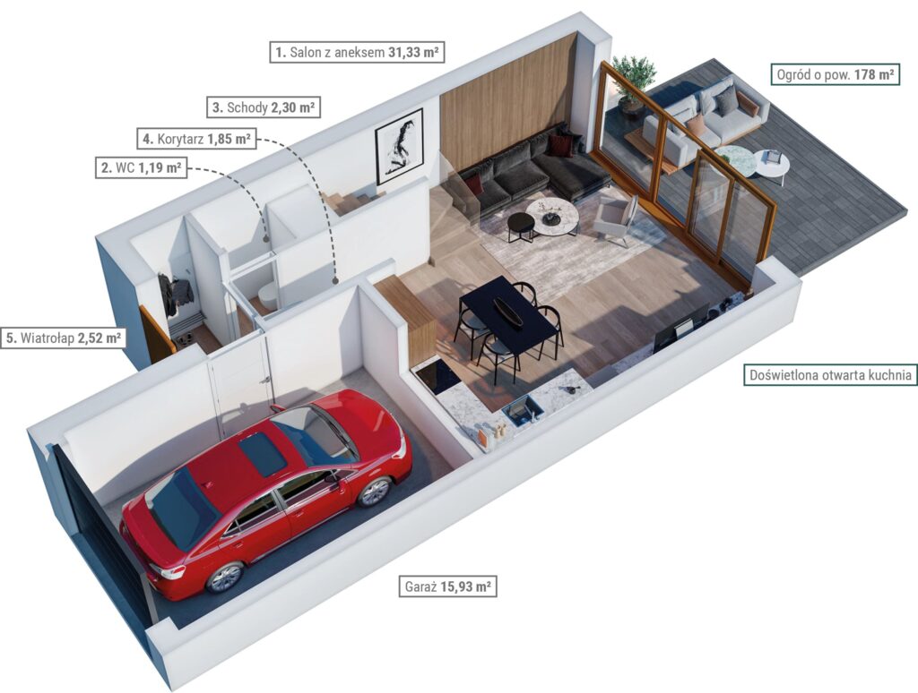 Zielony Zakątek to kameralne osiedle, obejmujące tylko 9 budynków w zabudowie bliźniaczej, czyli łącznie 18 domów – każdy o powierzchni 86,07 m². Mieszkańcy mają do dyspozycji prywatne ogrody z gotowym tarasem. W bryle budynku znajduje się również jednostanowiskowy garaż (ponad 15 m²), w którym pomieści nie tylko samochód, ale i rowery czy narzędzia. Do posesji prowadzi utwardzona oraz oświetlona latarniami LED droga osiedlowa.